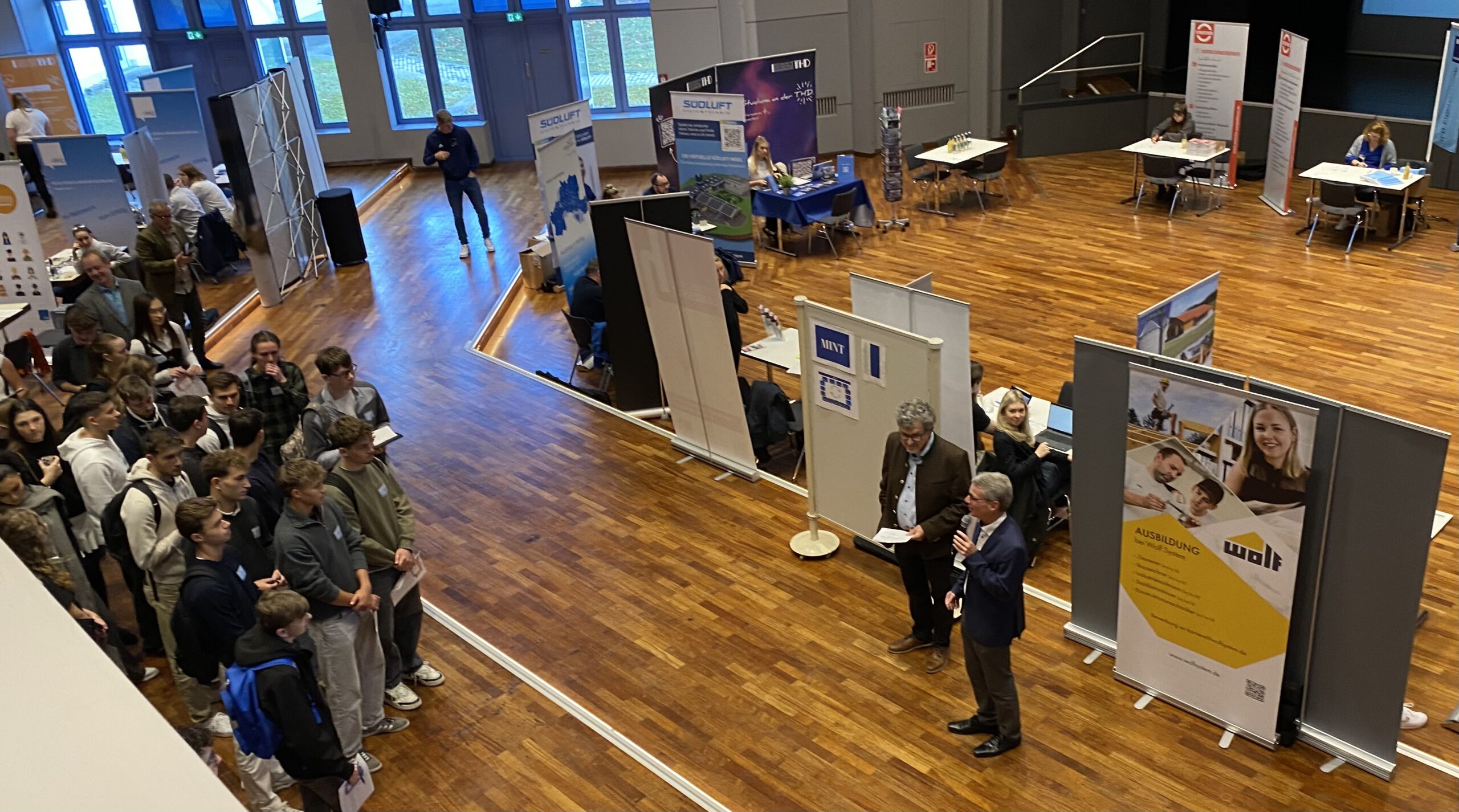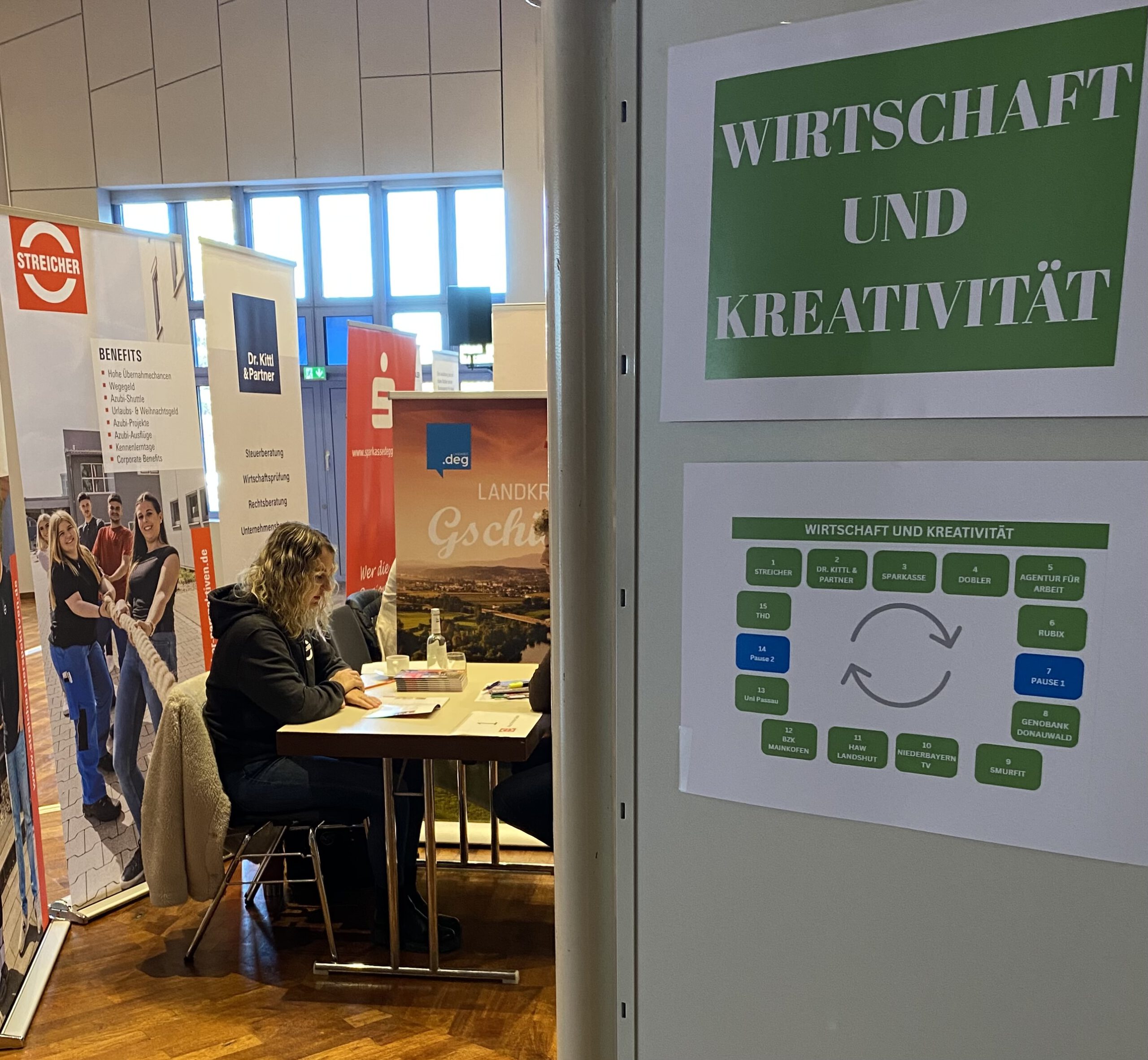 Im Rahmen der Tage zur beruflichen Orientierung fand in der Stadthalle Deggendorf in Zusammenarbeit mit dem Regionalmanagement Deggendorf und der Bundesagentur für Arbeit ein Großevent für die Q13 des Robert-Koch-Gymnasiums statt, bei dem 27 Institutionen und Unternehmen aus der ostbayerischen Region vertreten waren. Im Zentrum standen die „Speeddating-Zirkel“: Hier absolvierten die Kollegiaten 8-minütige Vorstellungsgespräche mit Arbeitgebern aus ihrem Wunschberufsfeld und trainierten so die reale Bewerbungssituation. Ziel ist dabei das sogenannte „Match“: Bei gegenseitigem Interesse von Schülern und Unternehmen wird frühzeitig Kontakt für Ausbildung, duales Studium oder Praktika hergestellt, was insgesamt zur Stärkung der regionalen Wirtschaft beiträgt. Das Robert-Koch-Gymnasium ist die erste Schule ihrer Art, mit der das Pilotprojekt „Unternehmer-Speeddating“ initiiert wurde. Federführend wurde der Tag von Herrn Herbert Altmann, Landratsamt Deggendorf, organisiert und in Zusammenarbeit mit OStRin Julia Baumann, Fachleiterin für Wirtschaft, Wirtschaftsinformatik und Geographie am Robert-Koch-Gymnasium, entwickelt.