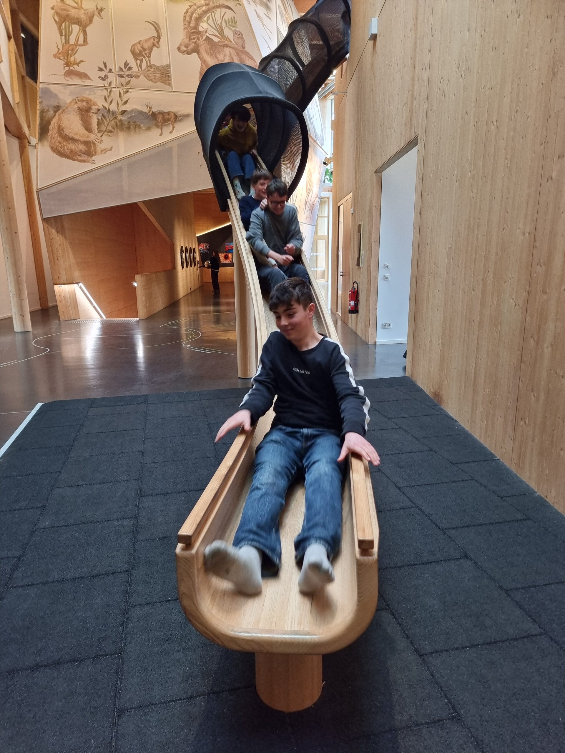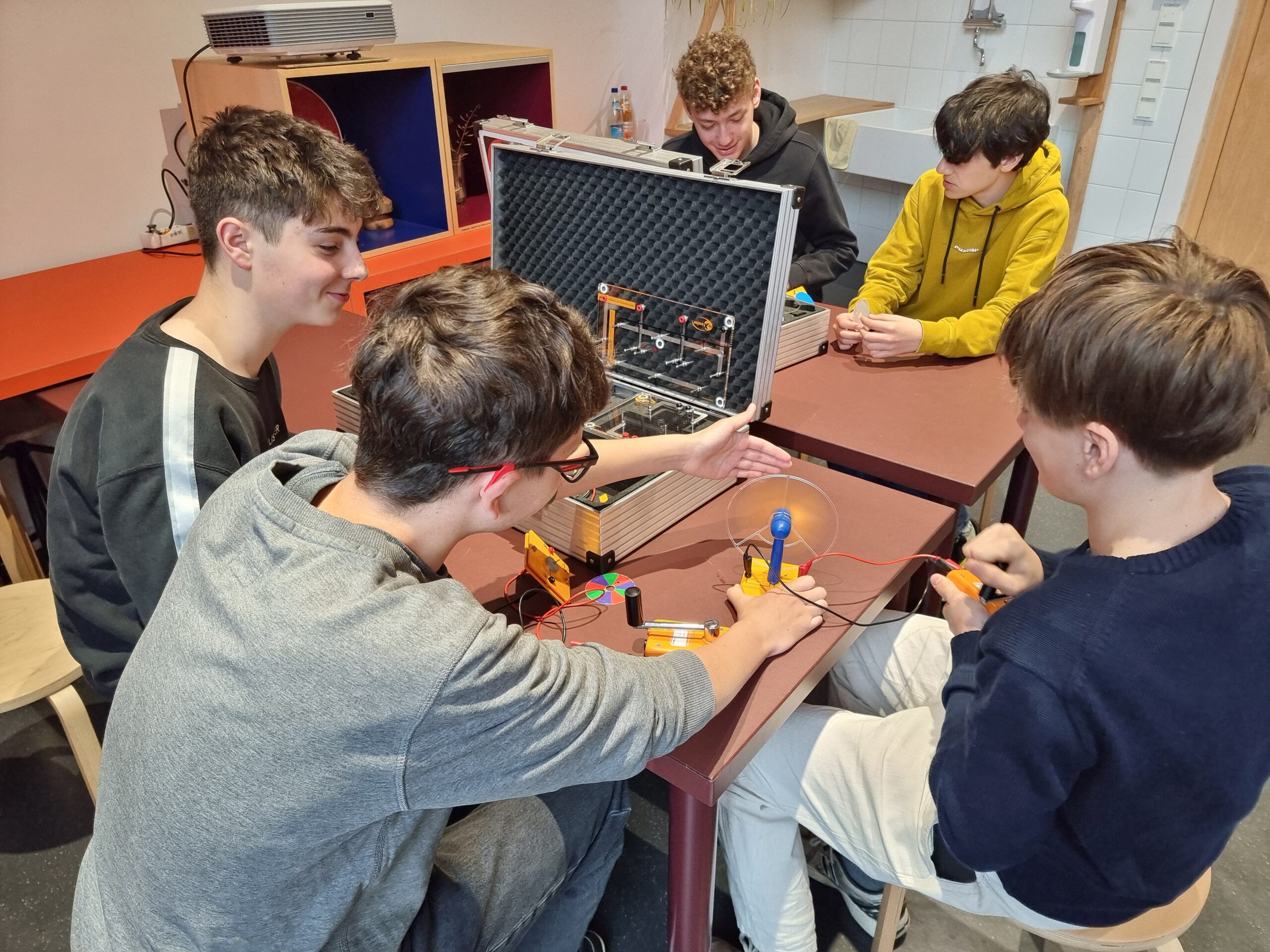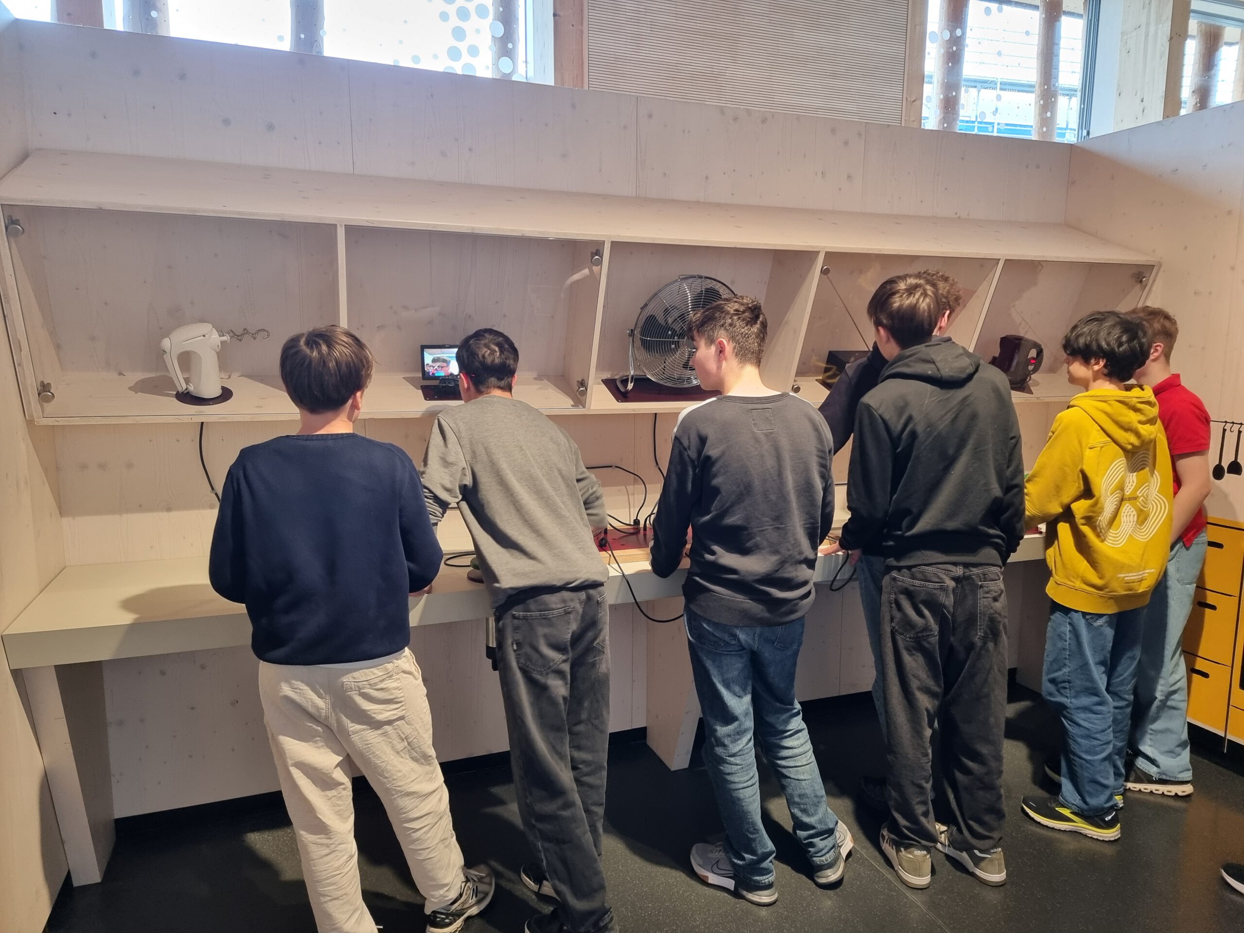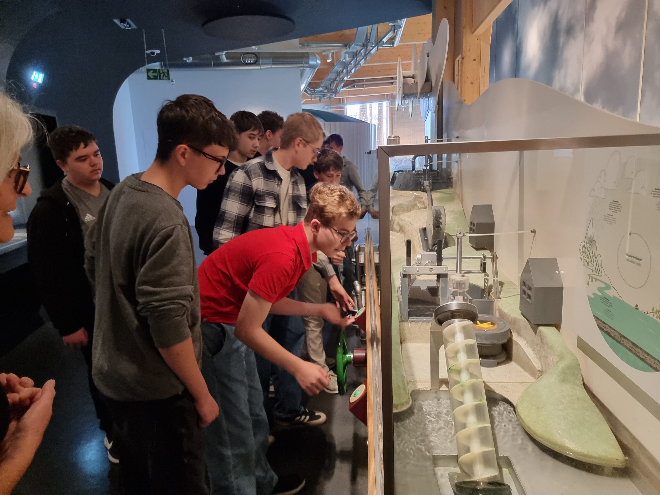 In Kleingruppen wurden die Schülerinnen und Schüler mit ihren Lehrern Markus Schmid, Norbert Leutschafft und Monika Trum unter fachkundiger Führung durch die modernen Abteilungen des Museums geleitet und bekamen Informationen zum zeitgemäßen Umgang mit erneuerbaren Energien. Im dazu passenden Workshop konnten die Jugendlichen eigenständig und praktisch Experimente zu Photovoltaik, Windkraft und mechanischer Energie durchführen. Dabei wurde fleißig mit Muskelkraft gekurbelt und ausprobiert, wie man mit Wind oder Sonne an selbstgebauten Schaltsystemen Strom erzeugen kann. Nach dem Praxisteil blieb noch genug Zeit zum eigenen Erkunden der Ausstellungen und Anwenden des Gelernten auf der hauseigenen Rutsche.