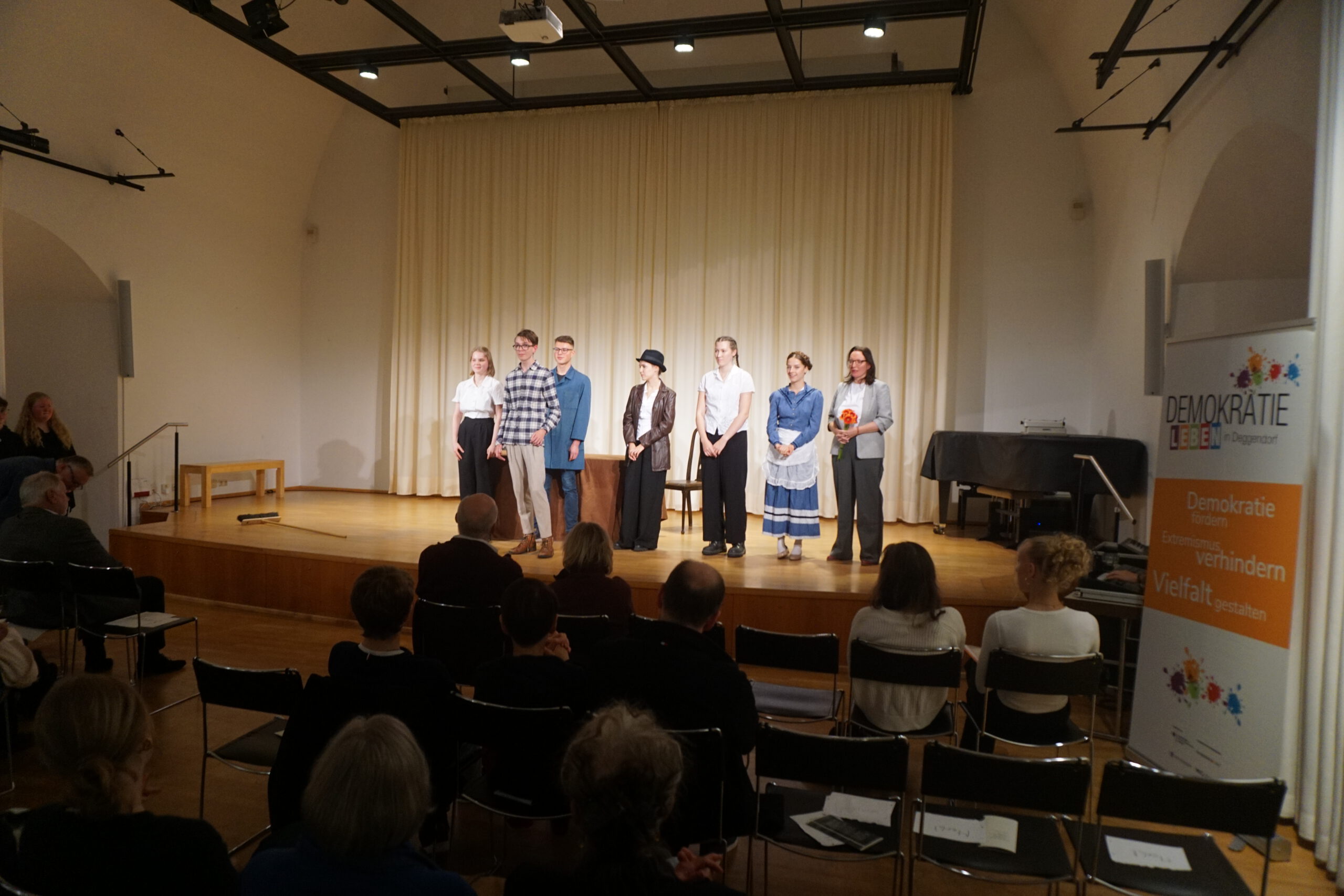 „Nichts ist schöner als die Freiheit des Gedankens“ – dieser Satz von Alexander Schmorell, Teil der Widerstandsgruppe „Weiße Rose“ gegen das NS-Regime im Zweiten Weltkrieg, lässt die schweren inneren Kämpfe nur erahnen, die ein Mensch in sich trägt, wenn diese Freiheit der Gedanken sich nicht vereinbaren lässt mit den äußeren Zwängen, die ein „freies“ Handeln nur sehr schwer möglich machen. Mit diesem Widerspruch befasst sich auch das Theaterstück „Wie sie den Himmel verdunkeln“ von Jörg Neugebauer und Elvira Lauscher, das das Umfeld und die Hauptfiguren der „Weißen Rose“ näher beleuchtet. Das Oberstufentheater des Robert-Koch-Gymnasiums unter der Regie von OStRin Susanne Loring hat sich, unterstützt vom P-Seminar „Rund um Theater und Film“ und der Technikgruppe des Gymnasiums, dieses ernsten, aber nichtsdestoweniger bis heute relevanten Stoffes angenommen. Nach der Premiere im letzten Jahr an der Schule erfolgte nun eine weitere Aufführung im Kapuzinerstadl in Deggendorf, zu der Ursula Keßler von der Initiative „Demokratie leben in Deggendorf“ und Susanne Loring die interessierten Zuschauer herzlich begrüßten. Veranstaltet wurde der Theaterabend neben dem Robert-Koch-Gymnasium vom Kinderschutzbund Deggendorf-Plattling e.V. im Rahmen der Veranstaltungsreihe der „Wochen der Begegnung“ der Stadt Deggendorf.