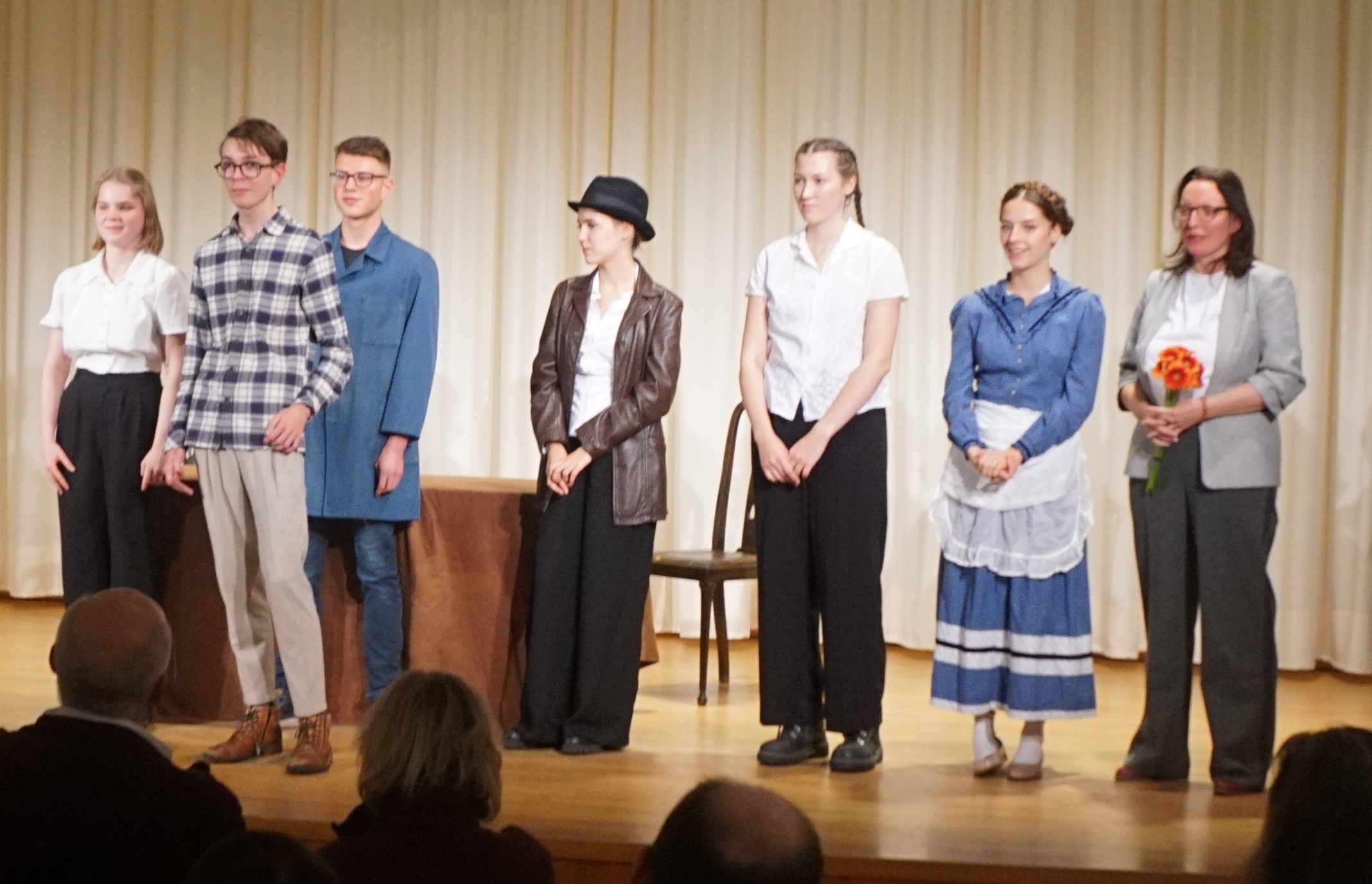 Mit großem Applaus bedachte das Publikum das kleine Ensemble samt Spielleiterin und zeigte sich beeindruckt von der Eindringlichkeit, mit der dieser so ernste und schwierige Stoff auf die Bühne gebracht worden war. Dies galt auch für die Nebenfiguren. Maya Schießl stellte die eher um Harmonie und Optimismus in der Familie bemühte Inge Scholl überzeugend dar. Auch Elektra Moos (Hans‘ Freundin Lisa Remppis + Mutter Scholl), Jana Gaschler (Hans‘ Freundin Rose Nägele + Verhörperson) und Nico Saller (Alexander Schmorell + Hausmeister Jakob Schmid) boten ihre verschiedenen und mitunter sehr gegensätzlichen Rollen beeindruckend dar. Am Ende richteten Katharina Kroiss und Quirin Hofbrückl im Namen der Mitwirkenden einige abschließende Worte ans Publikum, wobei sie einerseits ihre Dankbarkeit ausdrückten, „ihr“ Stück, das sie selbst ausgewählt und mitgestaltet hatten, in so würdigem Ambiente wie dem Kapuzinerstadl noch ein letztes Mal aufführen zu können, andererseits aber auch nochmals die thematische Bedeutung gerade für aktuelle politische Entwicklungen betonten. Sie wiesen auch auf die heutige Stiftung der „Weißen Rose“ hin. Und so blieb am Ende der Eindruck, dass man sich viel mehr dessen bewusst werden sollte, dass die Gedanken in jeglicher Hinsicht frei sind, was gerade in den vielen reflektierenden und angeregten Gesprächen der Beteiligten mit den Zuschauern im Anschluss an die Aufführung deutlich wurde.