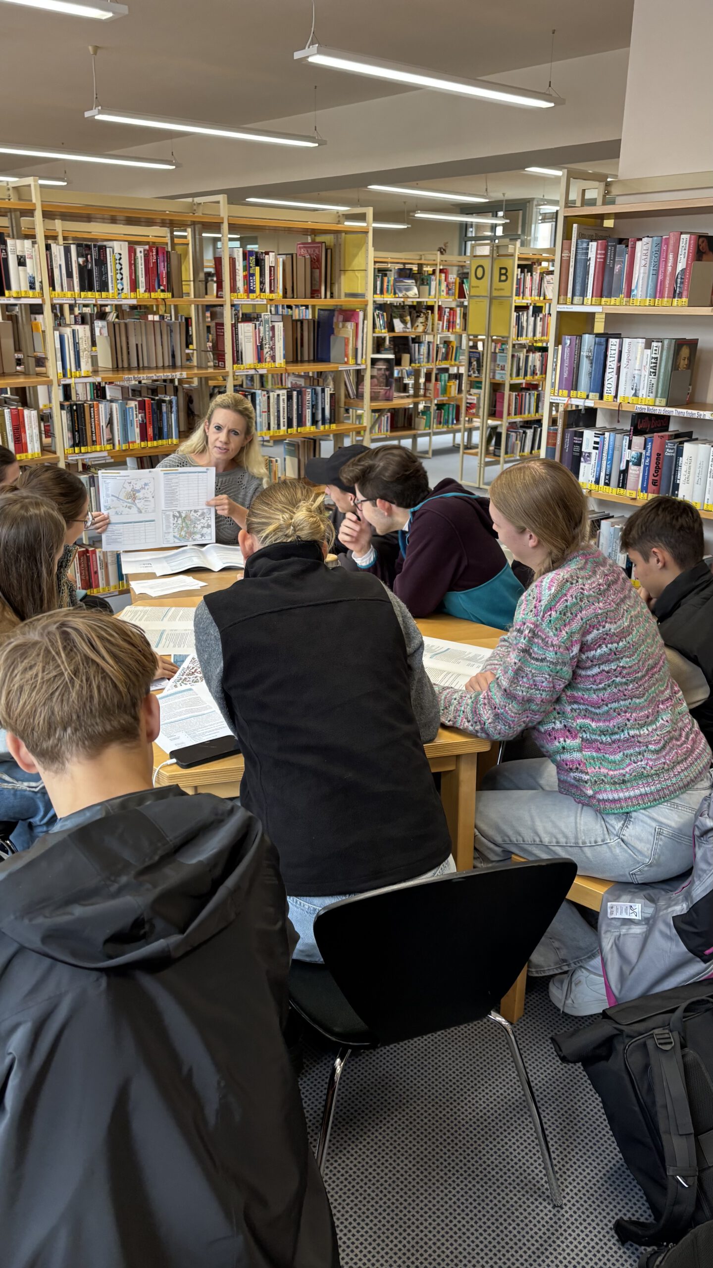 Im Anschluss daran beschäftigten sich die Schüler anhand von Karten- und Textmaterialien in der Stadtbibliothek mit der Frage, warum Deggendorf bayernweit als eine von nur acht Modellstädten ausgewählt wurde, die zukünftige Stadtentwicklung auf sich verändernde klimatische Bedingungen auszurichten und jenen gerecht zu werden.