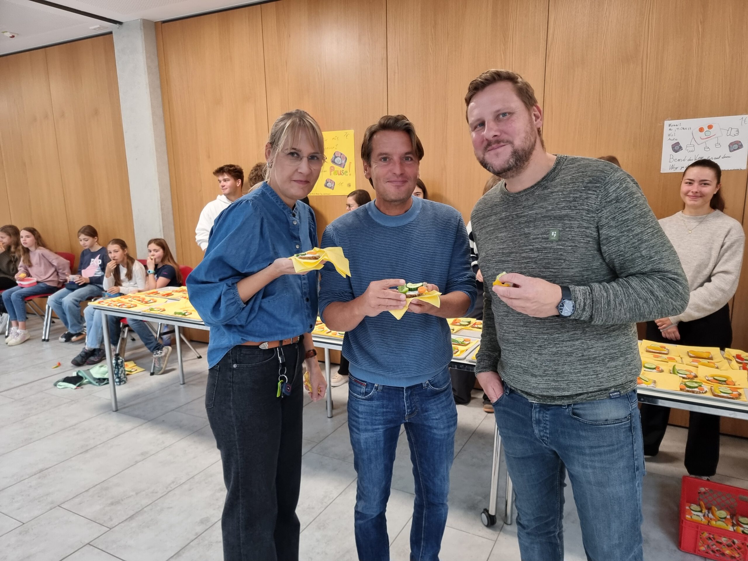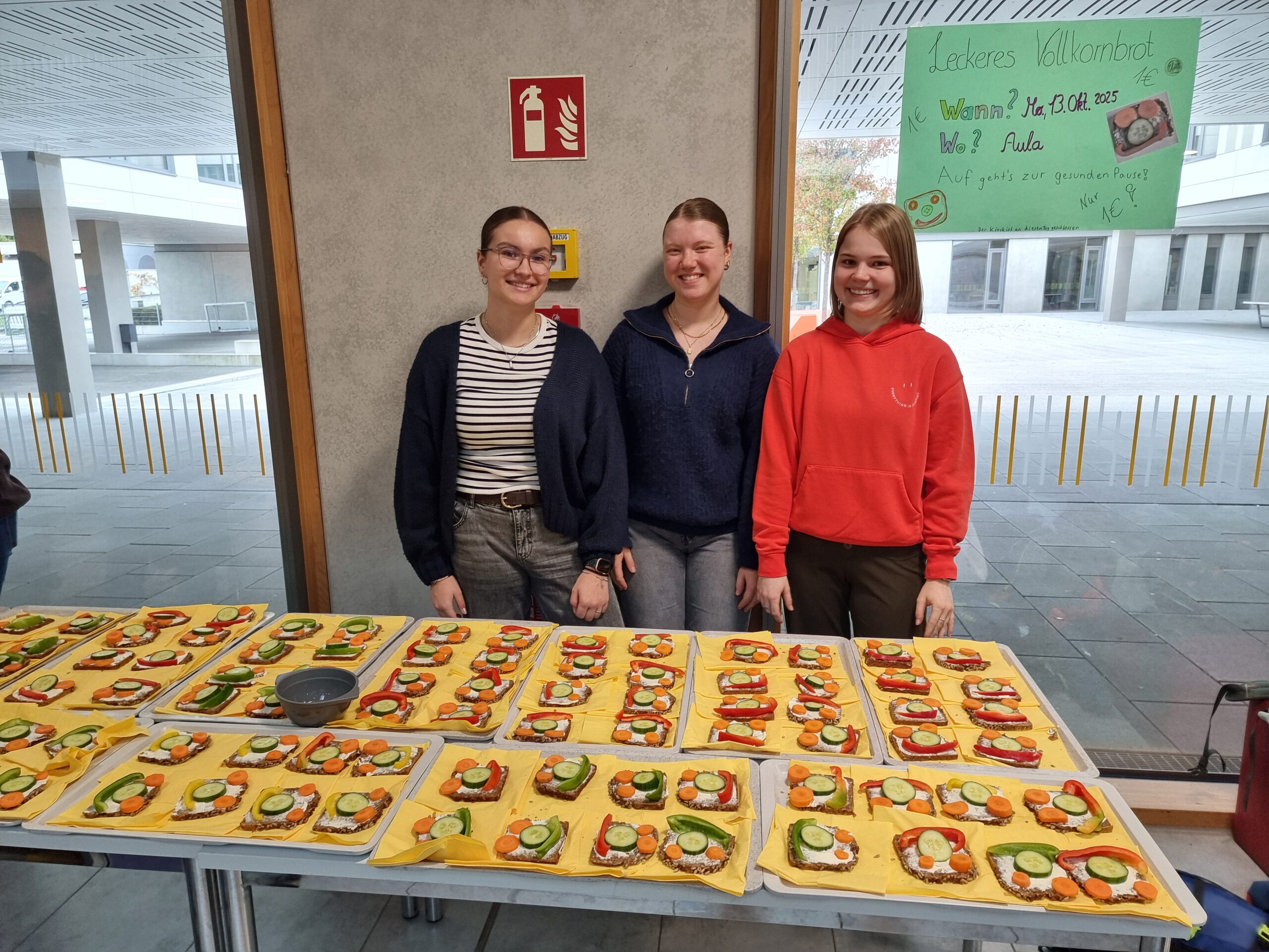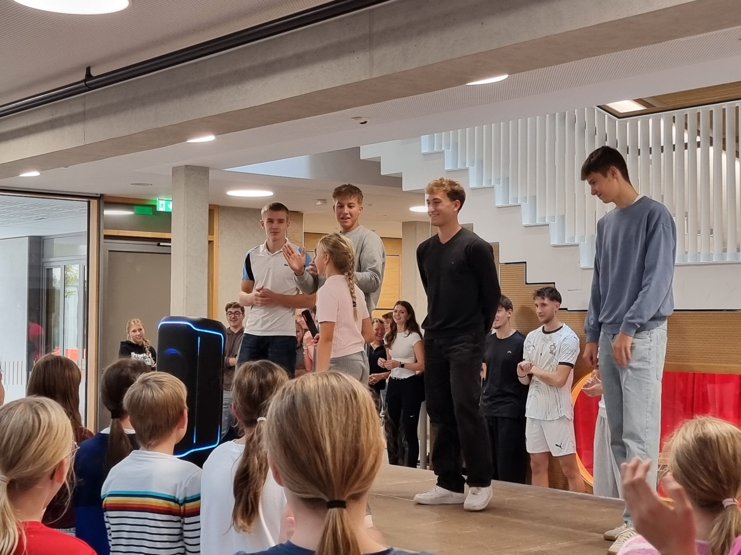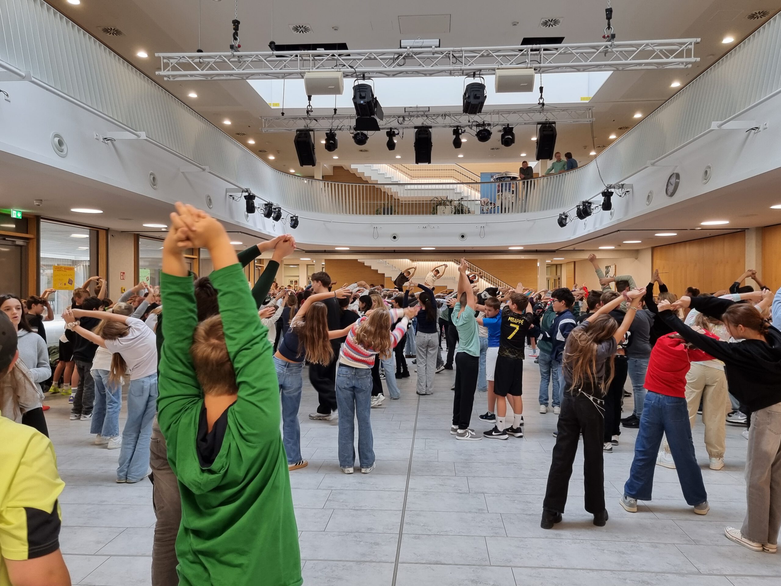 Das Lehrerteam mit Michael Ertl, Ingrid Naber, Monika Trum, Laura Wilhelm und Ruth Zeitlhöfler griffen die zentralen Schlagwörter Gesundheit und Nachhaltigkeit auf und setzten diese mit Bewegung, gesunder Ernährung und einer Mitmachausstellung um. Für die Unterstufe gab es eine bewegte Unterrichtsstunde und für die ganze Schulfamilie eine gesunde Pause. Dabei wurden sie tatkräftig von den Schülerinnen und Schülern des Leistungsfaches Sport Q13 und den Leistungsfächern Biologie Q12 und Q13 unterstützt. Die Sport-Abiturientinnen und Abiturienten zeigten den Fünft- und Sechstklässlern auf der Bühne lustige Bewegungsabläufe zum Aufwärmen, Dehnübungen und Fitnessspiele, die mit Partymusik untermalt wurden. Bei dem Spruch: „Leo sagt: Mach die Robbe“ fanden sich 257 Kids begeistert auf dem Boden des Foyers und zeigten großartige Verrenkungen der Arme und Beine, die einer Robbe glichen. Aber auch beliebte Tänze mit klassischer Choreographie, wie Macarena oder Cotton Eye Joe, bei denen man beim Stoppen der Musik erstarren musste, waren ein Highlight für die Unterstufenschüler. Nach der schweißtreibenden Sporteinheit konnten die Energiereserven durch den Verzehr lachender Vollkornbrote aufgefüllt werden. Die Kollegstufenschüler der beiden Bio-Leistungsfächer schmierten dazu fleißig Frischkäse auf Vollkornbrotscheiben und verzierten diese mit Karottenaugen, Gurkennase und Paprikamund. Der Fünftklässler Maximilian verkündete voller Stolz am Ende der Pause: „Eigentlich mag ich kein Körnerbrot, aber das war richtig lecker! Das muss ich öfter essen!“