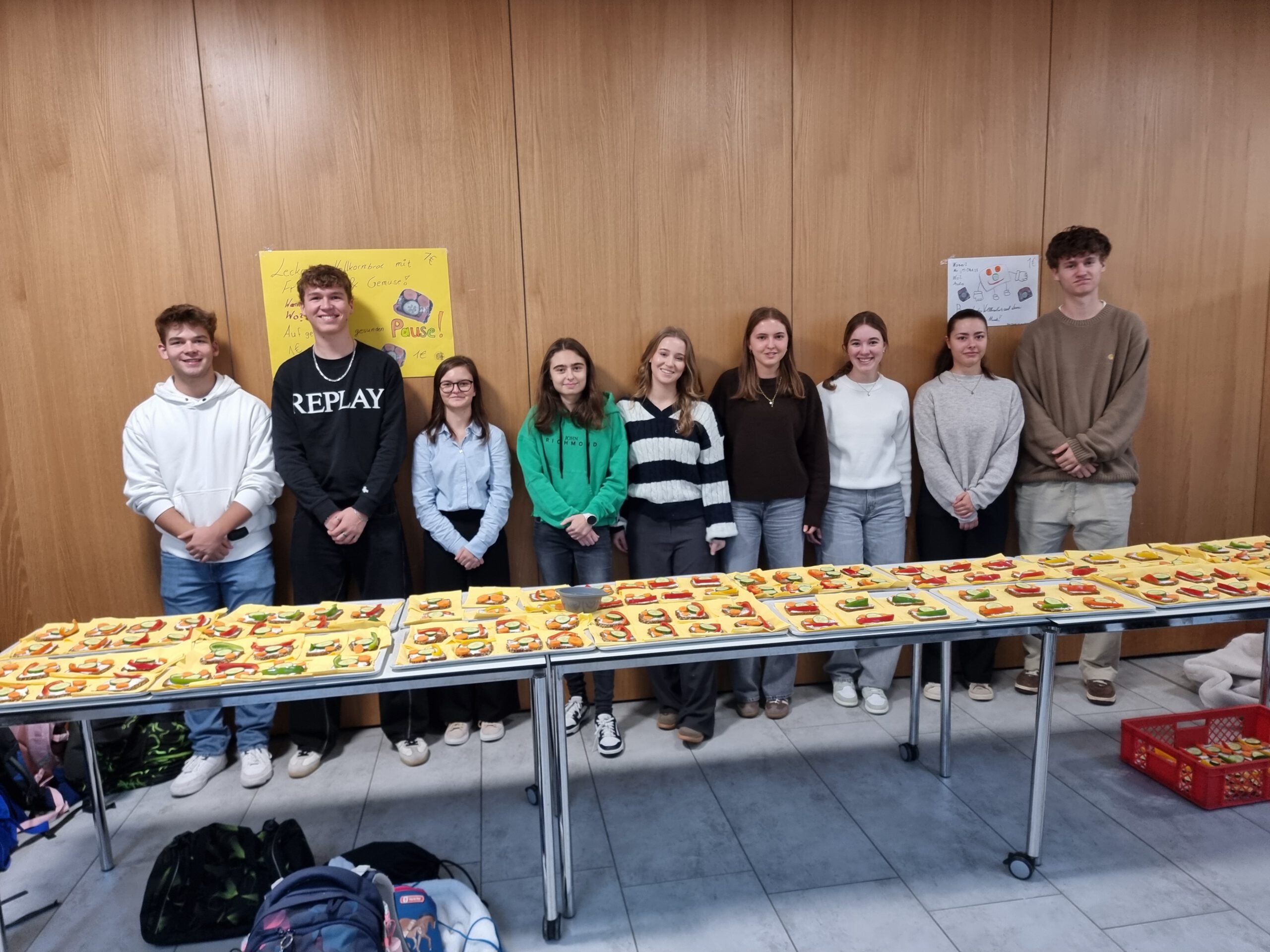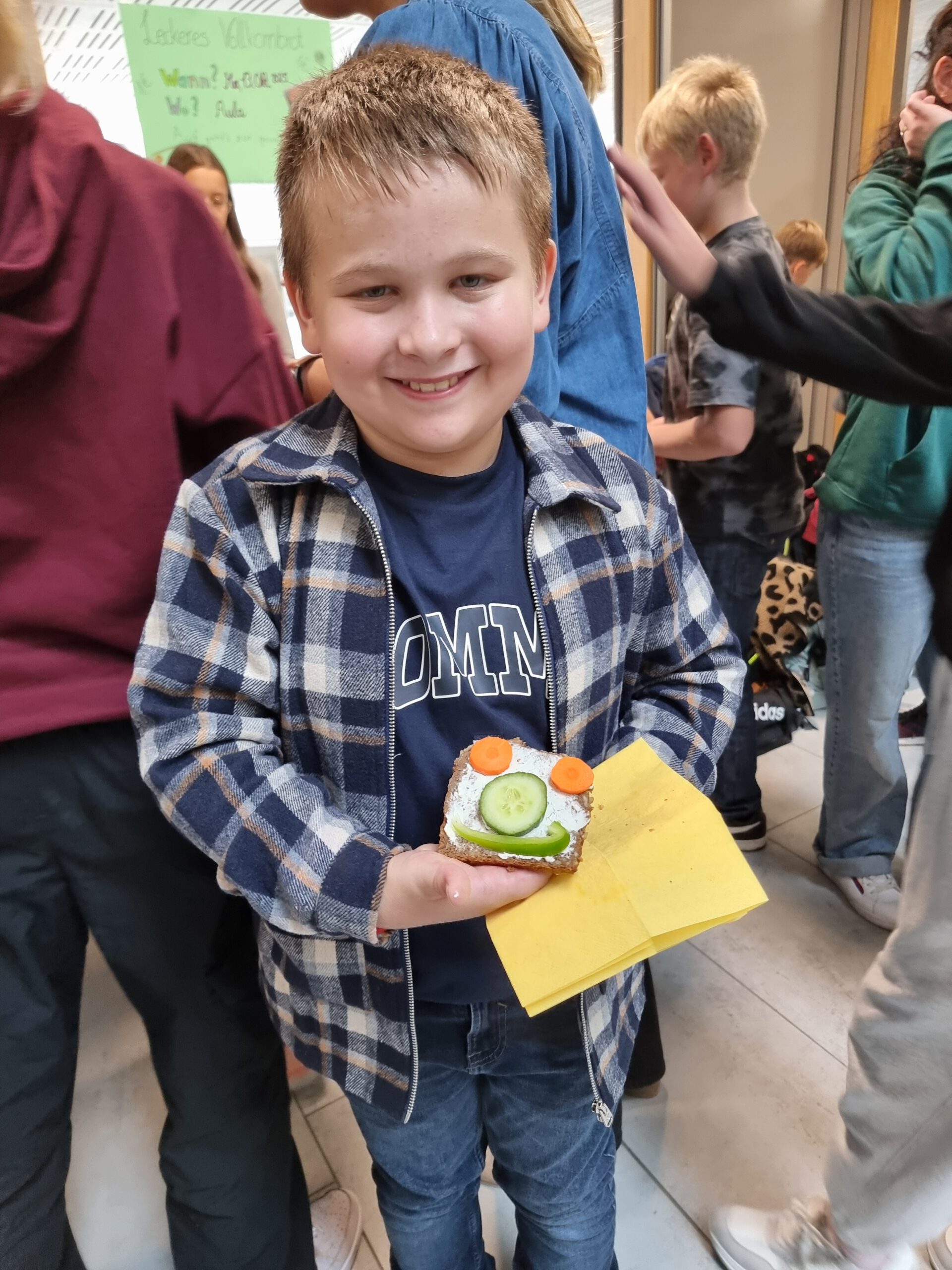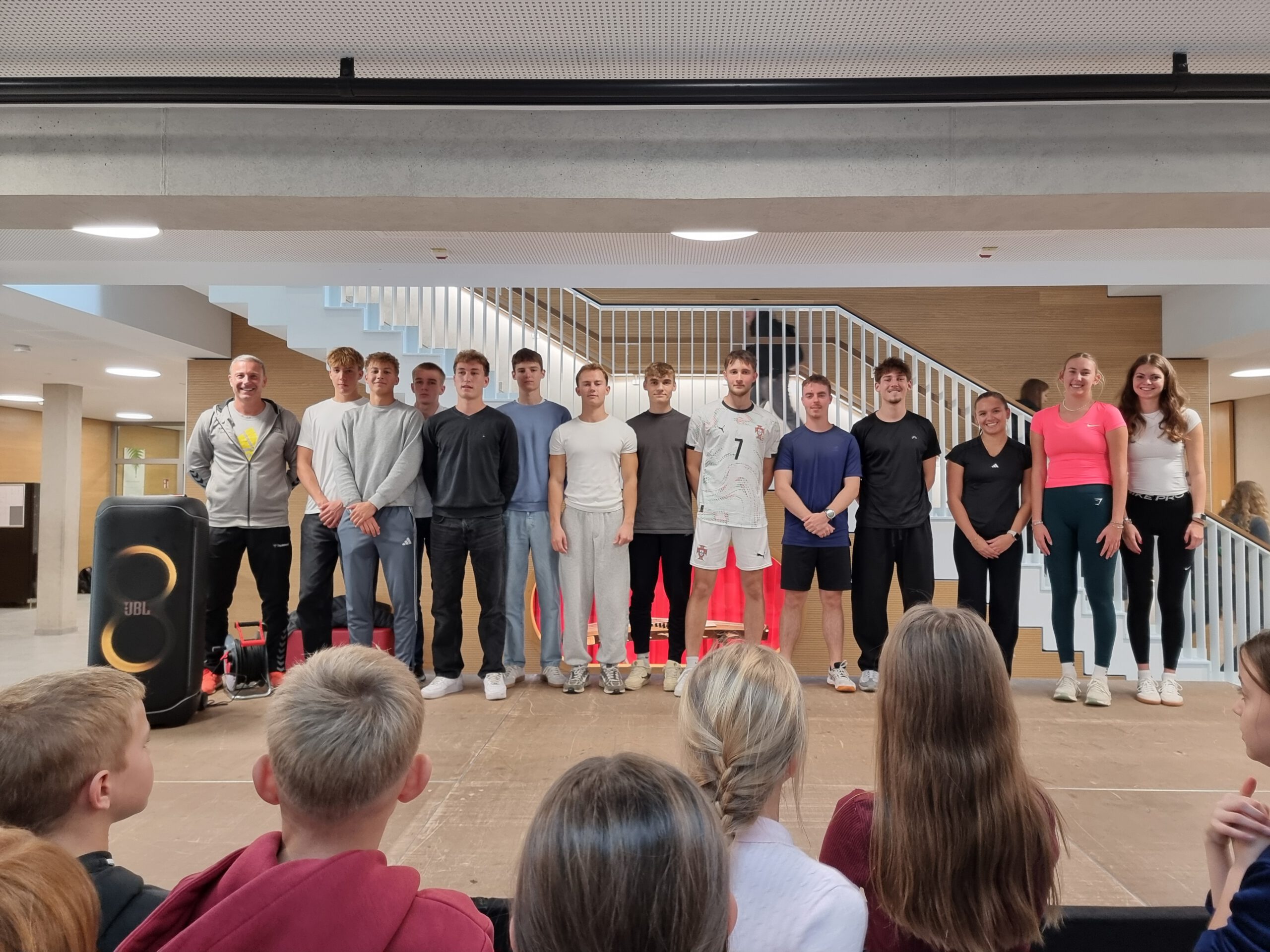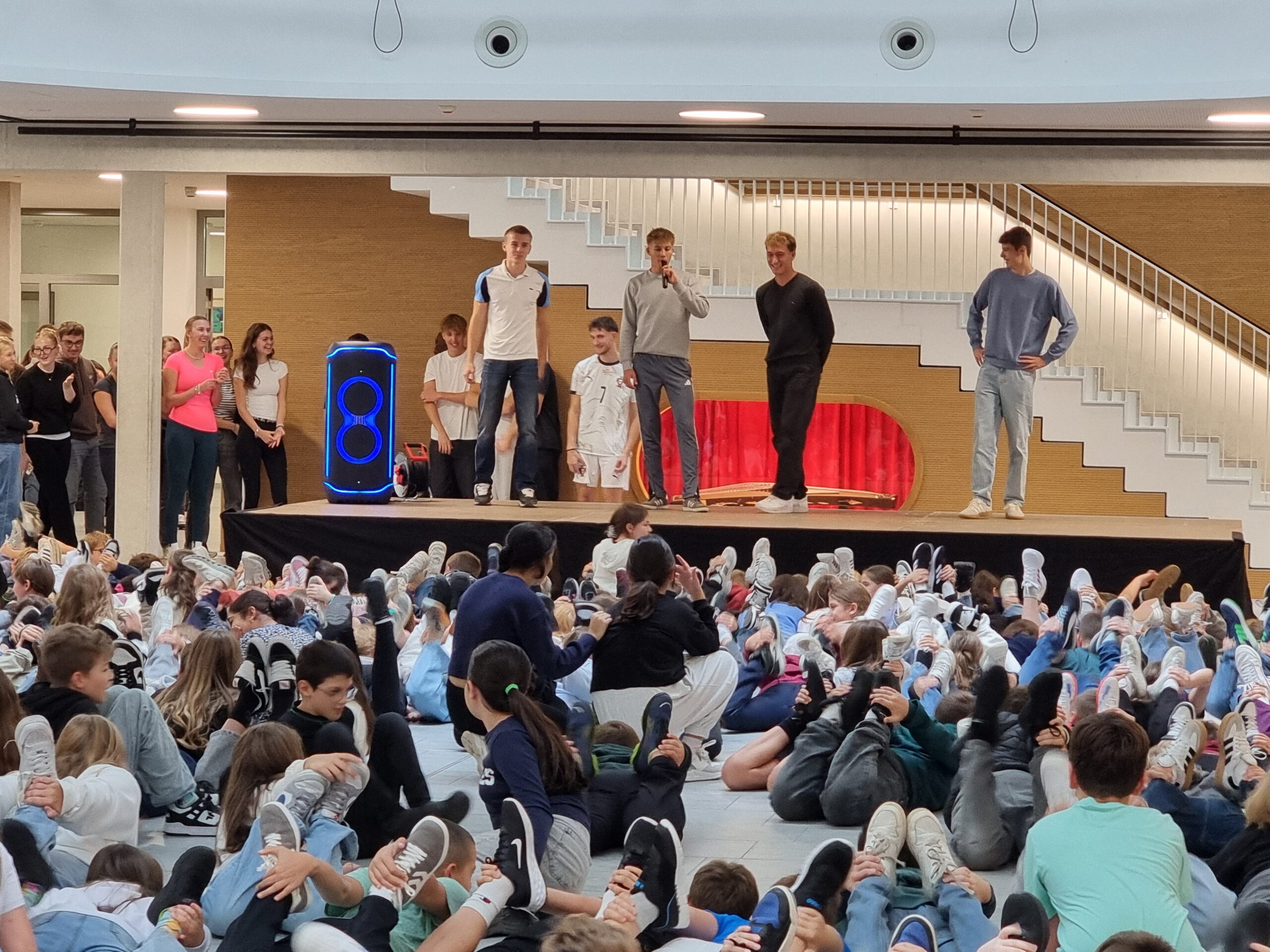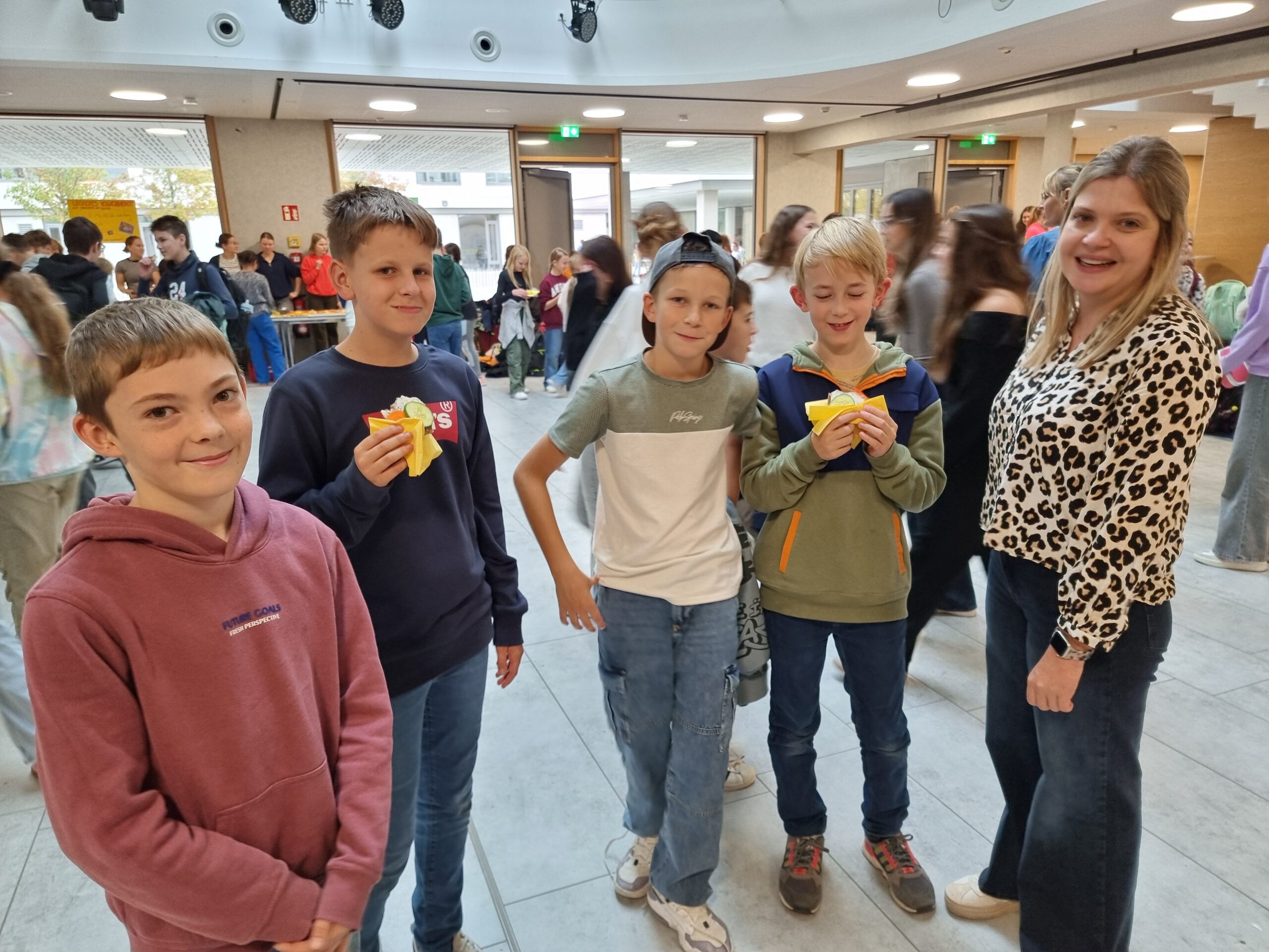 Das Lehrerteam mit Michael Ertl, Ingrid Naber, Monika Trum, Laura Wilhelm und Ruth Zeitlhöfler griffen die zentralen Schlagwörter Gesundheit und Nachhaltigkeit auf und setzten diese mit Bewegung, gesunder Ernährung und einer Mitmachausstellung um. Für die Unterstufe gab es eine bewegte Unterrichtsstunde und für die ganze Schulfamilie eine gesunde Pause. Dabei wurden sie tatkräftig von den Schülerinnen und Schülern des Leistungsfaches Sport Q13 und den Leistungsfächern Biologie Q12 und Q13 unterstützt. Die Sport-Abiturientinnen und Abiturienten zeigten den Fünft- und Sechstklässlern auf der Bühne lustige Bewegungsabläufe zum Aufwärmen, Dehnübungen und Fitnessspiele, die mit Partymusik untermalt wurden. Bei dem Spruch: „Leo sagt: Mach die Robbe“ fanden sich 257 Kids begeistert auf dem Boden des Foyers und zeigten großartige Verrenkungen der Arme und Beine, die einer Robbe glichen. Aber auch beliebte Tänze mit klassischer Choreographie, wie Macarena oder Cotton Eye Joe, bei denen man beim Stoppen der Musik erstarren musste, waren ein Highlight für die Unterstufenschüler. Nach der schweißtreibenden Sporteinheit konnten die Energiereserven durch den Verzehr lachender Vollkornbrote aufgefüllt werden. Die Kollegstufenschüler der beiden Bio-Leistungsfächer schmierten dazu fleißig Frischkäse auf Vollkornbrotscheiben und verzierten diese mit Karottenaugen, Gurkennase und Paprikamund. Der Fünftklässler Maximilian verkündete voller Stolz am Ende der Pause: „Eigentlich mag ich kein Körnerbrot, aber das war richtig lecker! Das muss ich öfter essen!“