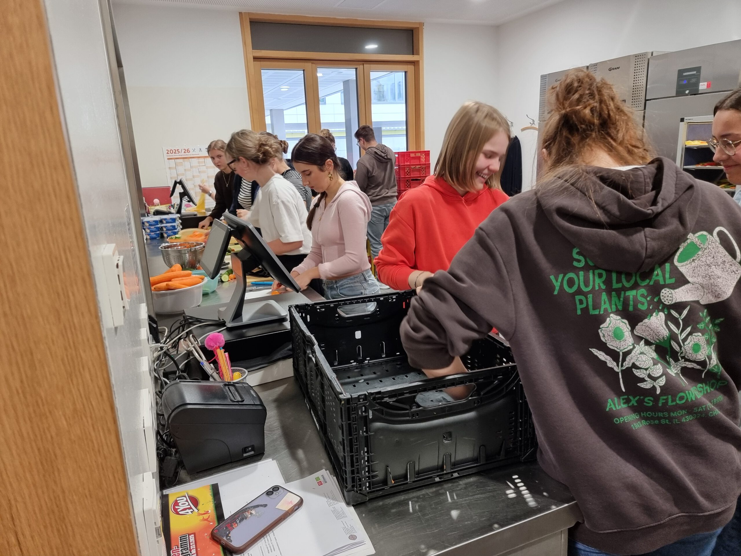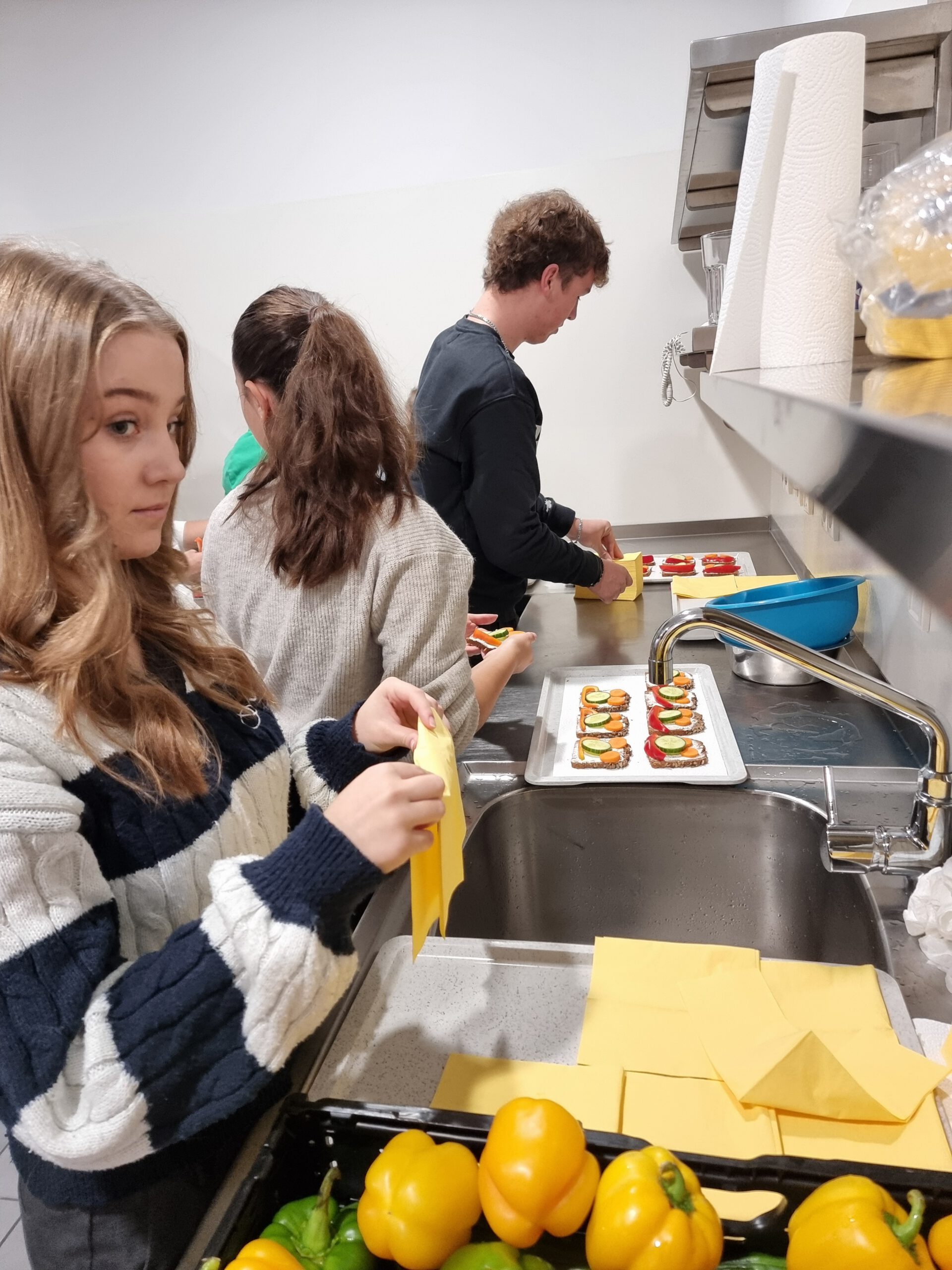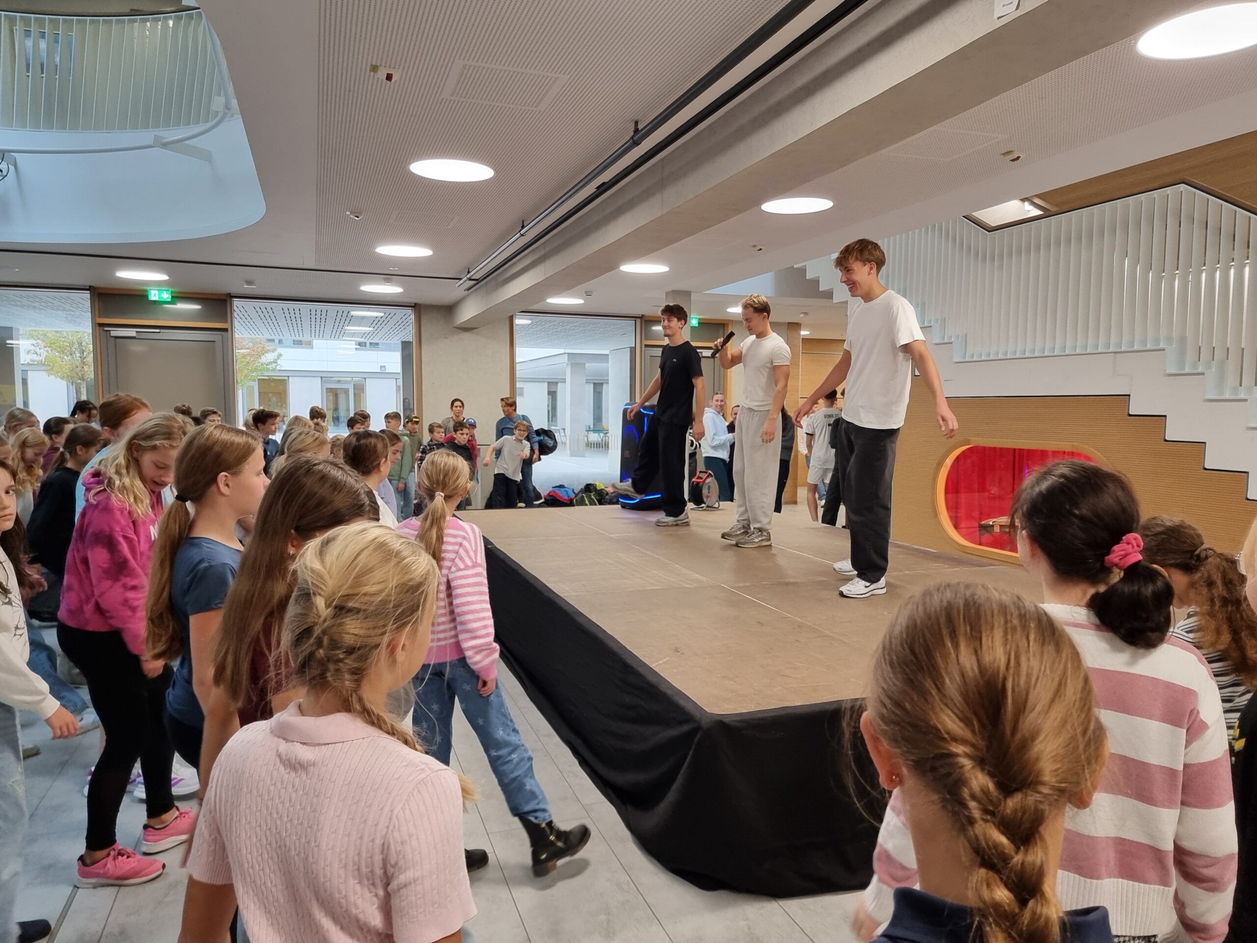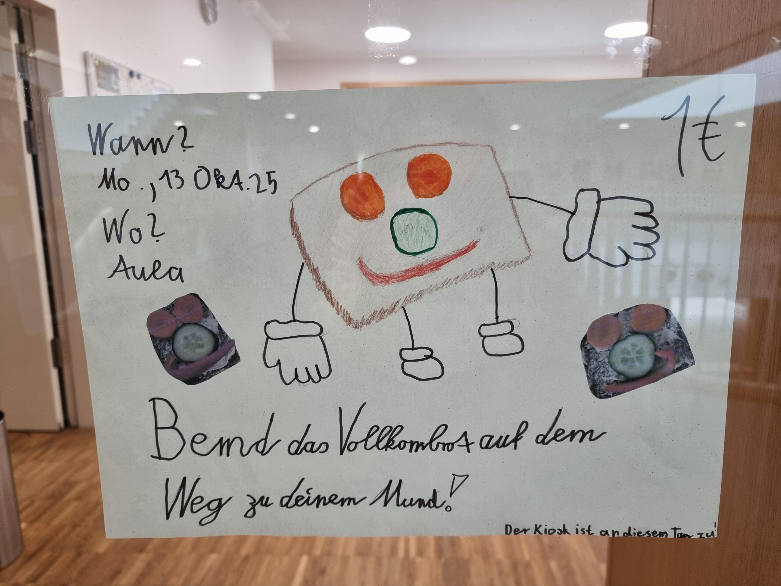 Das Lehrerteam mit Michael Ertl, Ingrid Naber, Monika Trum, Laura Wilhelm und Ruth Zeitlhöfler griffen die zentralen Schlagwörter Gesundheit und Nachhaltigkeit auf und setzten diese mit Bewegung, gesunder Ernährung und einer Mitmachausstellung um. Für die Unterstufe gab es eine bewegte Unterrichtsstunde und für die ganze Schulfamilie eine gesunde Pause. Dabei wurden sie tatkräftig von den Schülerinnen und Schülern des Leistungsfaches Sport Q13 und den Leistungsfächern Biologie Q12 und Q13 unterstützt. Die Sport-Abiturientinnen und Abiturienten zeigten den Fünft- und Sechstklässlern auf der Bühne lustige Bewegungsabläufe zum Aufwärmen, Dehnübungen und Fitnessspiele, die mit Partymusik untermalt wurden. Bei dem Spruch: „Leo sagt: Mach die Robbe“ fanden sich 257 Kids begeistert auf dem Boden des Foyers und zeigten großartige Verrenkungen der Arme und Beine, die einer Robbe glichen. Aber auch beliebte Tänze mit klassischer Choreographie, wie Macarena oder Cotton Eye Joe, bei denen man beim Stoppen der Musik erstarren musste, waren ein Highlight für die Unterstufenschüler. Nach der schweißtreibenden Sporteinheit konnten die Energiereserven durch den Verzehr lachender Vollkornbrote aufgefüllt werden. Die Kollegstufenschüler der beiden Bio-Leistungsfächer schmierten dazu fleißig Frischkäse auf Vollkornbrotscheiben und verzierten diese mit Karottenaugen, Gurkennase und Paprikamund. Der Fünftklässler Maximilian verkündete voller Stolz am Ende der Pause: „Eigentlich mag ich kein Körnerbrot, aber das war richtig lecker! Das muss ich öfter essen!“
