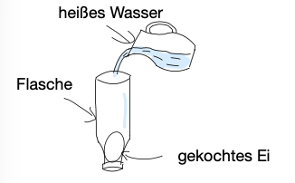 Das heiße Wasser erhitzt die Luft in der Flasche. Da sich warme Luft mehr ausdehnt, entweicht diese aus der Flasche. Beim Abkühlen der Flasche würde sich die Luft wieder zusammenziehen, weil das Ei den Flaschenzugang aber verschließt ,ist dies nicht so leicht möglich, wodurch ein Unterdruck entsteht. Der äußere Luftdruck drückt nun das Ei in die Flasche.
