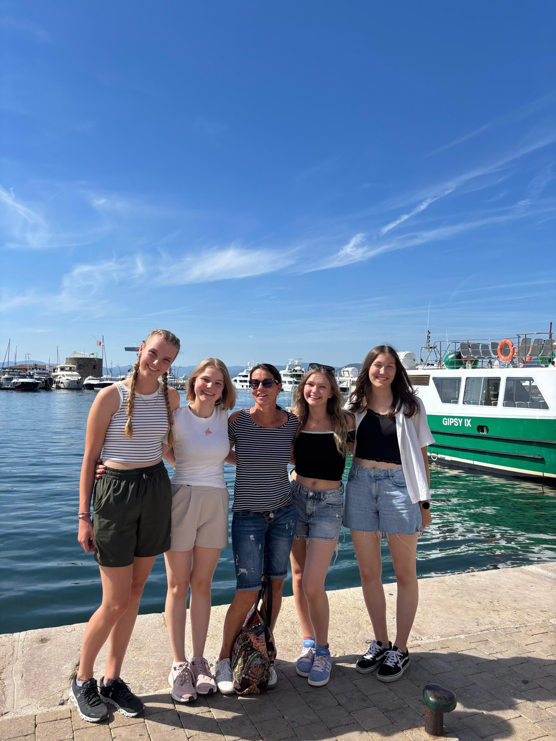 Gegen 10 Uhr vormittags kamen wir im Eurocamp Les Naïades in Grimaud an, das wir aufgrund der positiven Erfahrungen mit Eurocamp 2024 in der Normandie als Unterkunft ausgewählt hatten. Die Schülerinnen und Schüler wohnten zu viert oder zu sechst in Mobile Homes und konnten so ihre Verpflegung morgens und abends selbst in die Hand nehmen. Nach der Ankunft ging es gleich an den nahegelegenen Strand, wo ein erstes Bad im Meer die Lebensgeister wieder weckte. Zurück in der Anlage wurden dann die Mobile Homes bezogen, eingekauft und im Pool gebadet. Danach waren die meisten wieder fit genug, um abends noch den kleinen Hafen Port Grimaud zu erkunden.