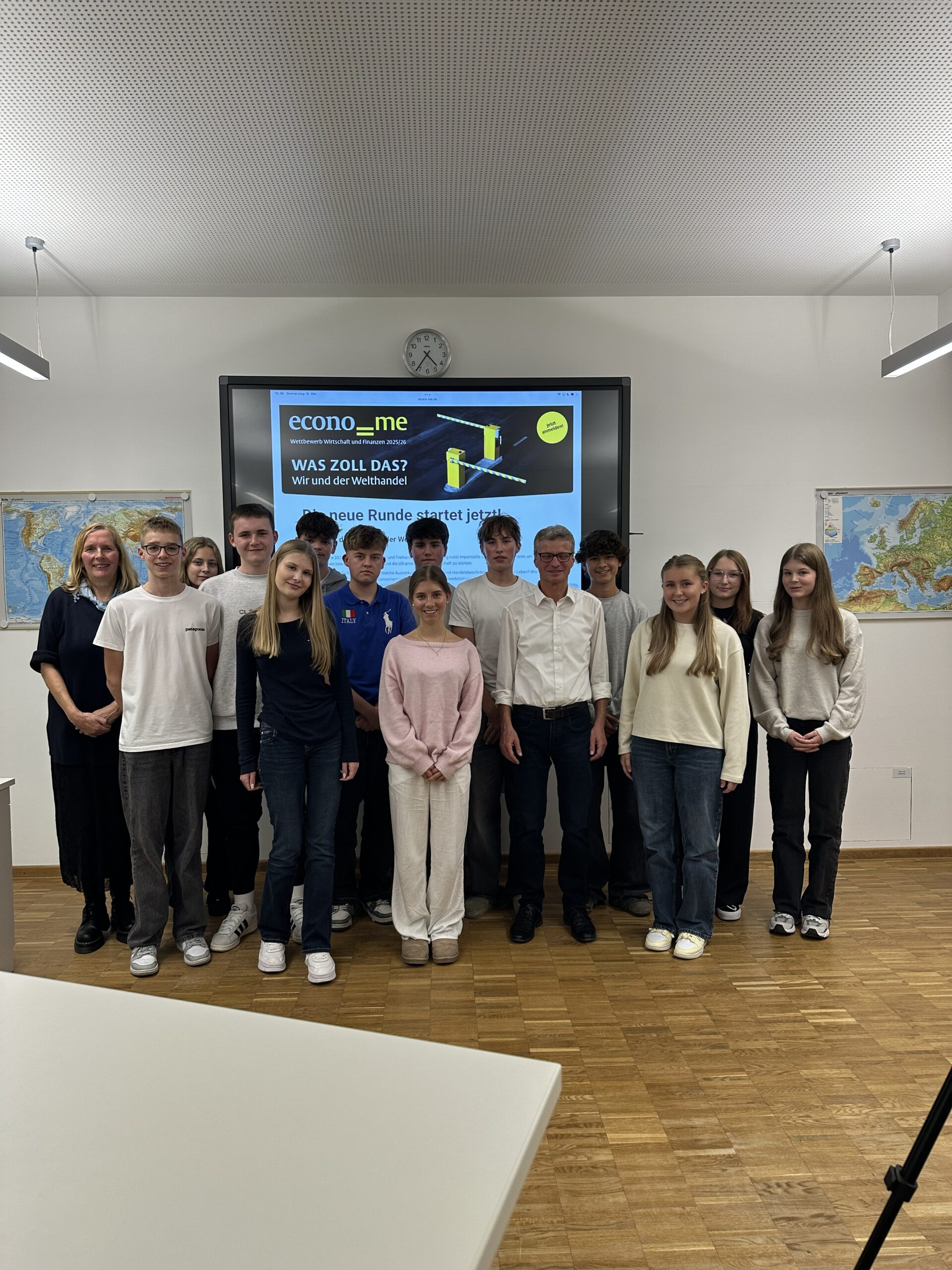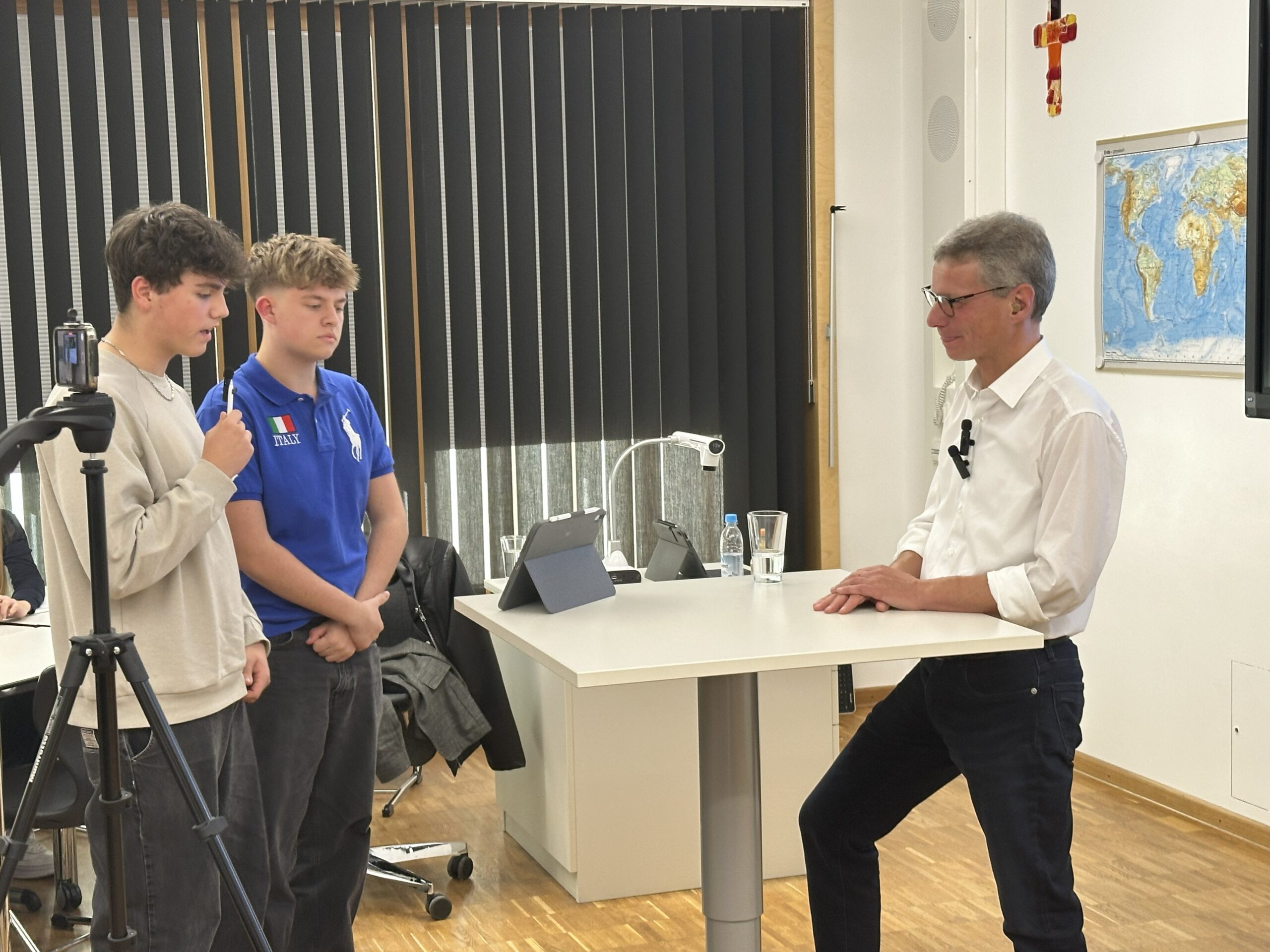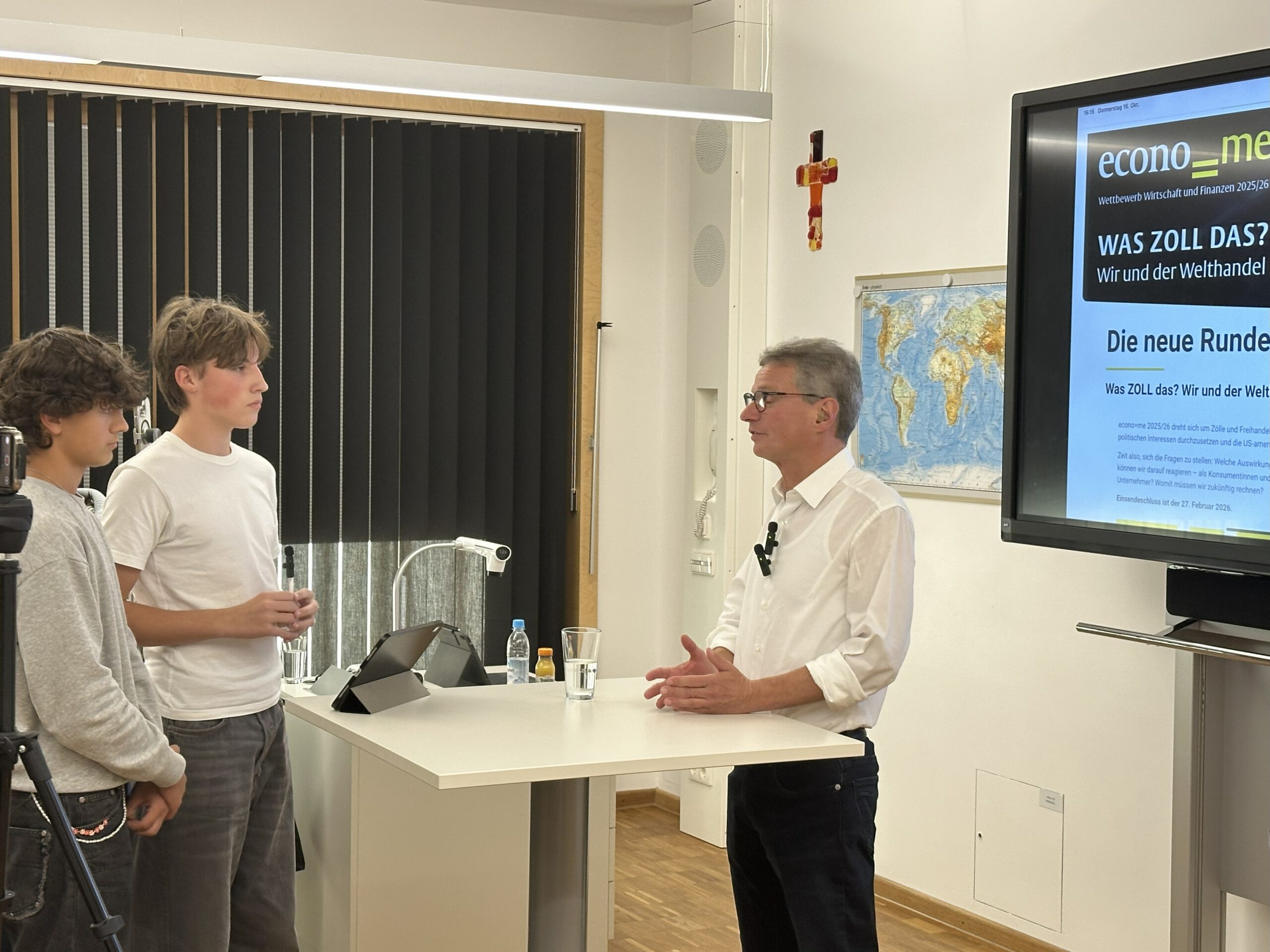 Die zwei Wettbewerbsgruppen interviewten unseren Landrat profimäßig zum Thema Zölle und bekamen interessante Einblicke mit regionalem Bezug, die sie sicher gut in ihrem Wettbewerbsbeitrag verarbeiten können!